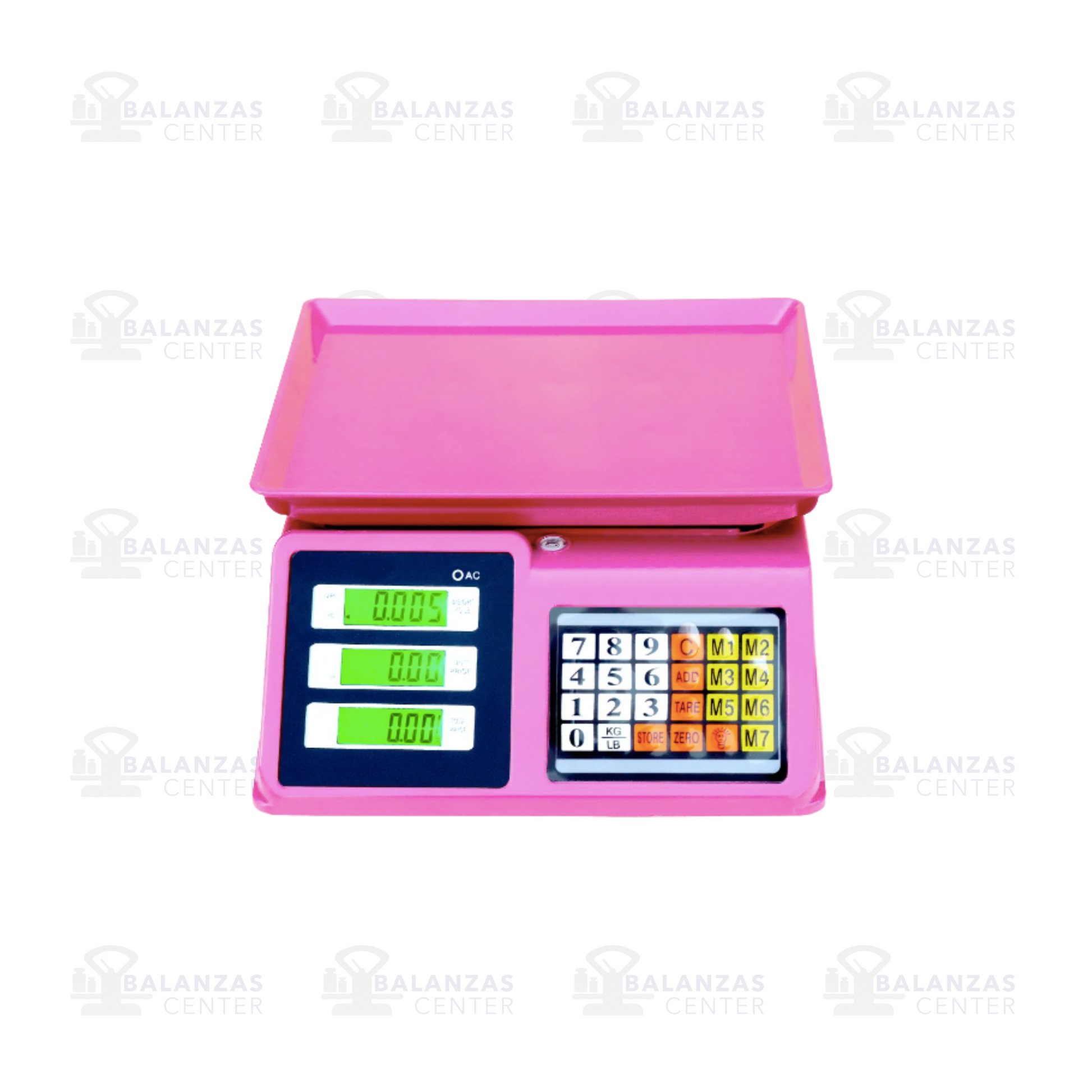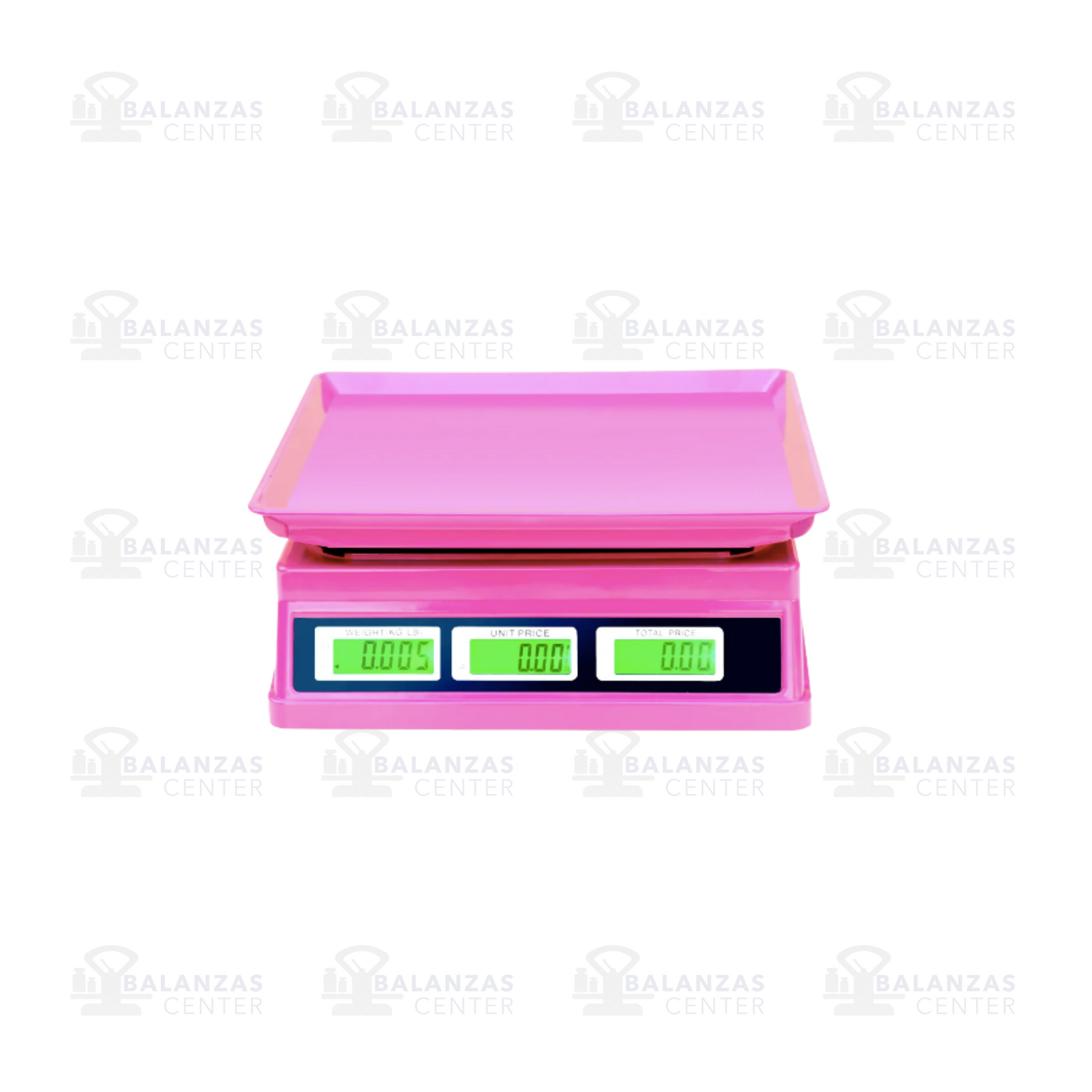 Balanza electrónica digital de mesa ideal para comercios que requieren pesajes rápidos y precisos, equipada con 6 pantallas LCD retroiluminadas de alta visibilidad que muestran peso, precio unitario e importe total tanto para el operador como el cliente. Incorpora funciones automáticas de TARA, CERO y cálculo total, además de 7 memorias programables para precios frecuentes. Funciona con corriente directa (220V) o batería recargable de larga duración (hasta 7 días). Cuenta con patas ajustables, nivel de burbuja integrado, plato de acero inoxidable fácil de limpiar y mica protectora contra líquidos y polvo. Su sistema de protección eléctrica con fusible, apagado automático y alarma de sobrepeso garantizan seguridad y durabilidad. Disponible en color morado.